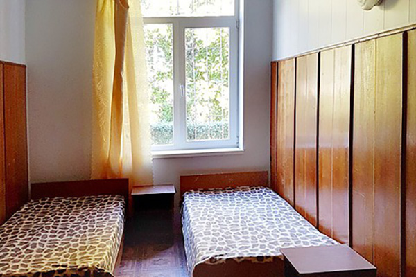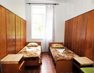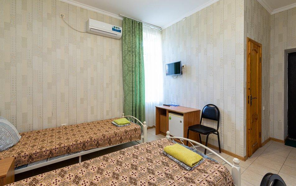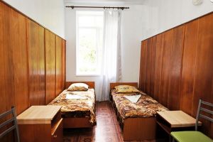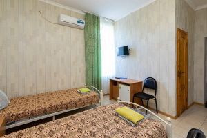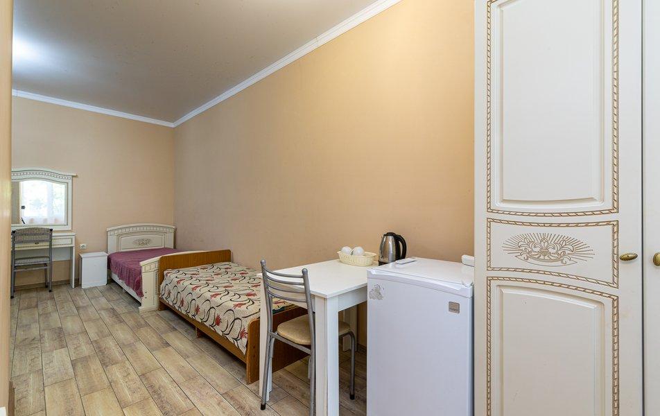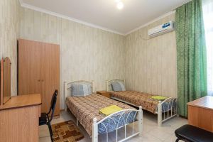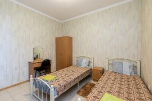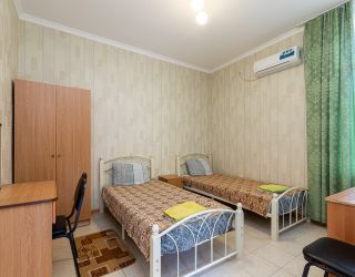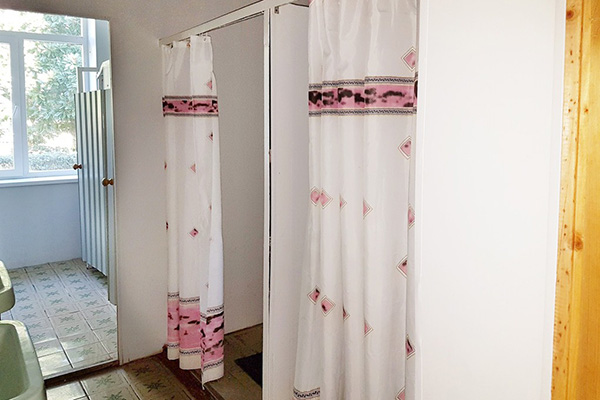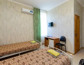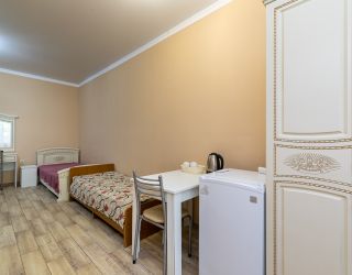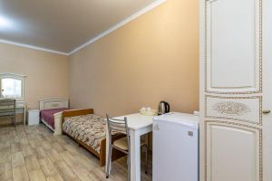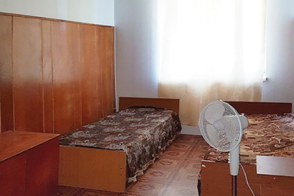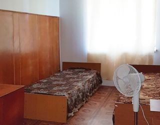 Кровать, тумбочка, шкаф, стул, вентилятор - в номере; душ, санузел, холодильник- в холле