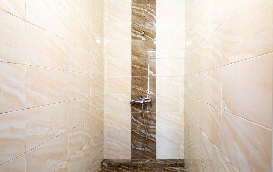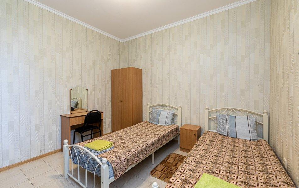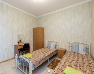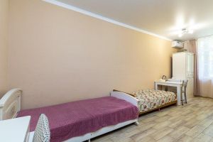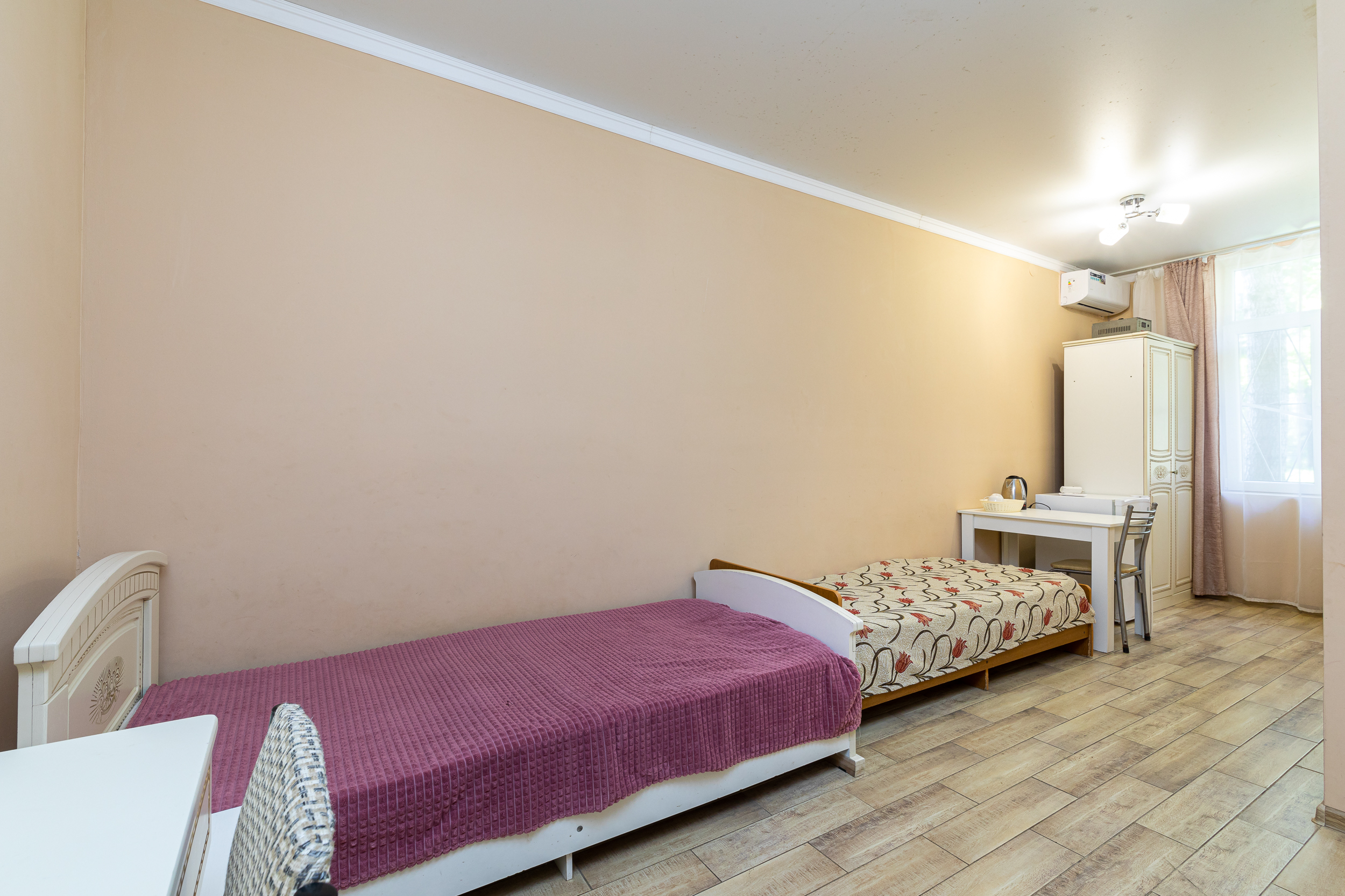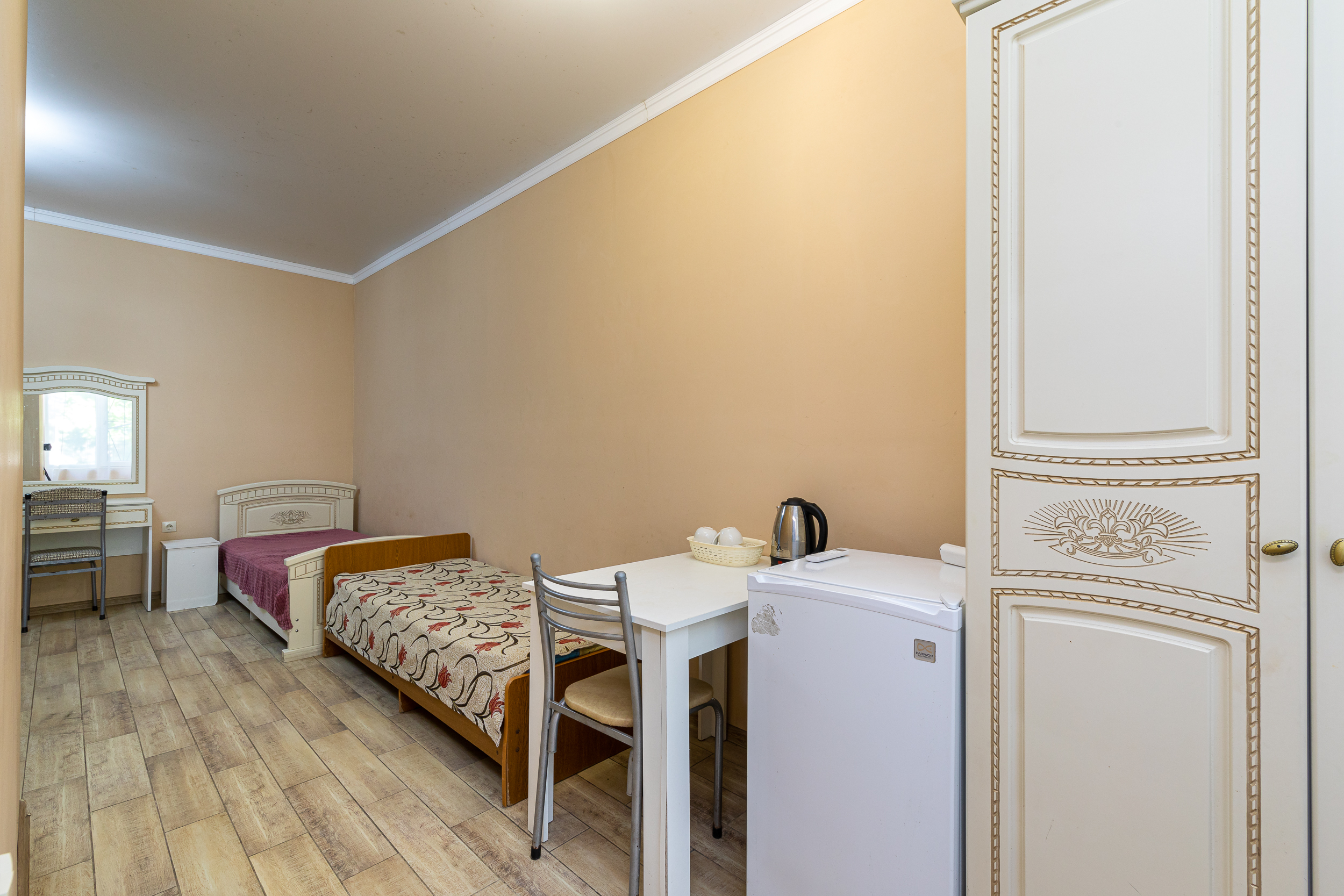 Кровать, тумбочка, шкаф, стул, вентилятор - в номере; душ, санузел, холодильник- в холле
