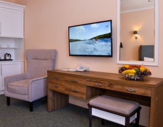 Просторный двухкомнатный номер повышенной комфортности. Выполнен в спокойной цветовой гамме, с видом на ландшафтный парк. Сделает отдых в нашем санатории незабываемым.