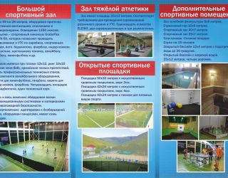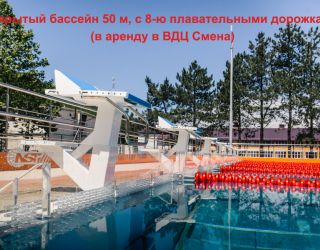Универсальный спортивный комплекс со спортивным залом площадью 1500 кв. м для игровых видов спорта и единоборств. Зал тяжелой атлетики с 11 помостами. Три открытые спортивные площадки с искусственным профессиональным покрытием для мини-футбола, волейбола, баскетбола, гандбола и стрит-бола. Закрытый бассейн, сауна. Открытый бассейн 50 м, с 8-ю плавательными дорожками (в аренду в ВДЦ Смена).