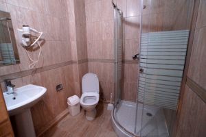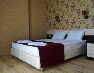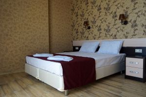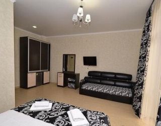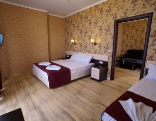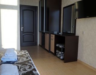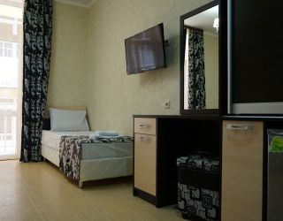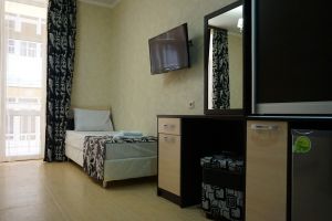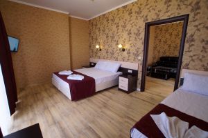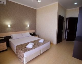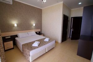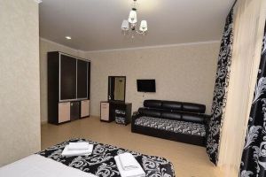 - Двухспальная кровать, односпальная кровать, двухспальный раскладной диван, кондиционер, шкаф, душ, фен, сейф, туалетные принадлежности, балкон, халаты