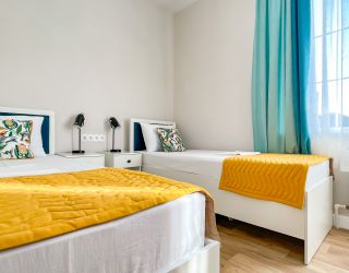 • двухспальная кровать, односпальная кровать, ТВ, холодильник, шкаф, столик, кондиционер, сан.узел с душемПокрытие пола - линолеум