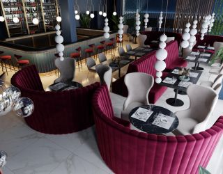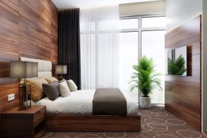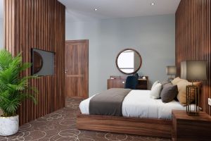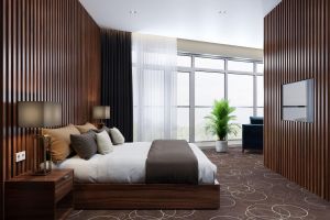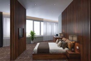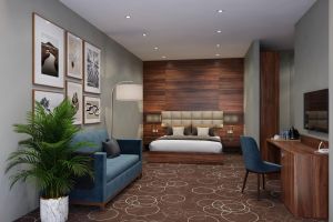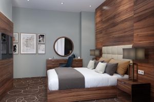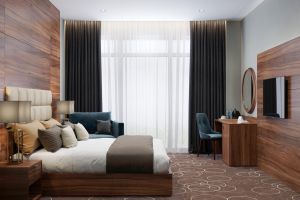 Мебель одна двуспальная кровать, багажная тумба, барная стойка, вешалки, зеркало, рабочий стол, раскладной диван, стол для переговоров, стул, стулья, шкаф для одежды