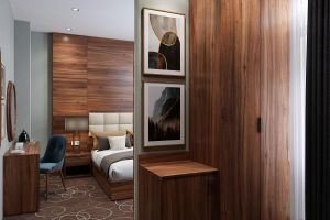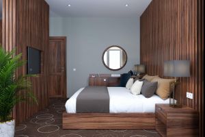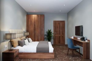 Мебель Двуспальная кровать, багажная тумба, зеркало, кресло, шкаф для одежды, письменный стол и стул, вешалки.