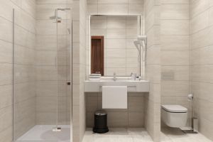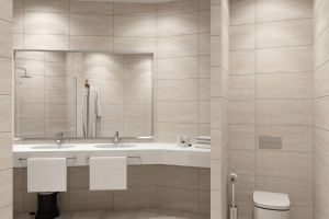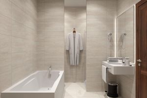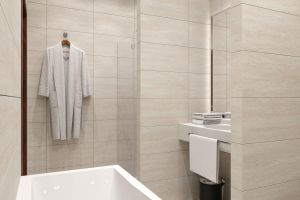 Ванная комната Душ, гигиенические средства, санузел, халаты, банные полотенца, косметические средства, раковина, тапочки, гостиничная парфюмерия.