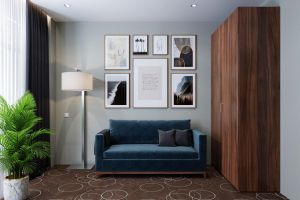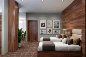 Мебель две двуспальные кровати, диван-кровать, багажная тумба, зеркало, диван-кровать, гардеробная, письменный стол и стул, вешалки.