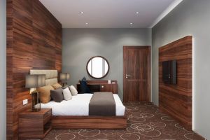 Мебель Двуспальная кровать, односпальная кровать, багажная тумба, зеркало, диван-кровать, гардеробная, письменный стол и стул, вешалки.