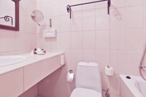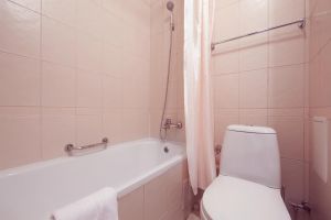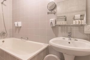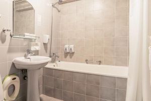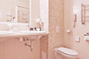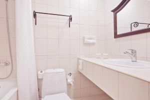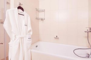 Ванна или душевая кабина, фен, детская подставка для ног, детское сиденье на унитаз, сушилка для белья, диспенсер с гигиеническими салфетками, комплект полотенец, халат, тапочки, набор гостиничной косметики.