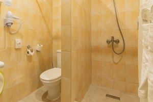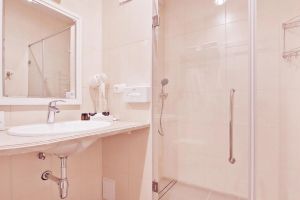 Душевая кабина, фен, детская подставка для ног, детское сиденье на унитаз, диспенсер с гигиеническими салфетками, комплект полотенец, халат, тапочки, набор гостиничной косметики.