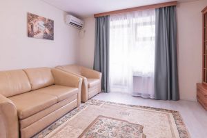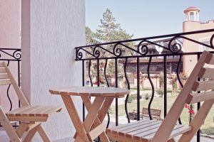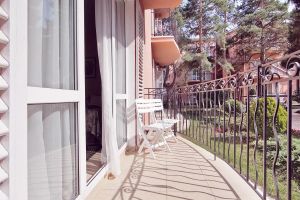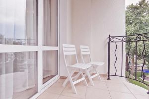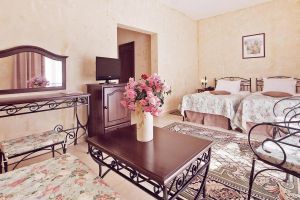 В двухкомнатном номере со спальней и гостиной свободно разместится семья из 2-х или 4-х человек. Он прекрасно подходит для тех, кто планирует совмещать отдых с работой. В номере два основных спальных места, при необходимости для сна можно использовать диван или кресло-кровать. Уютный интерьер в сдержанных тонах располагает к отдыху, а мебель с элементами ковки придает обстановке легкость и романтичность. В номере есть балкон с мебелью.