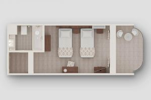 В одной комнате - двуспальная кровать или две односпальных, прикроватная тумба, туалетный столик, зеркало, стул, сплит-система, ЖК-телевизор, внутренний телефон. Во второй комнате - две односпальные кровати, прикроватная тумба, стол-тумба, мини-холодильник, ЖК-телевизор, сплит-система. В прихожей — шкаф, багажная полка, зеркало. Балкон отсутствует.