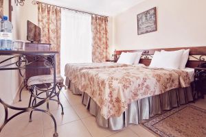 • Номер создан для комфортного размещения двоих гостей на основных местах и ещё одного – на дополнительном. Уютный и ненавязчивый интерьер в прованском стиле. Балкон отсутствует.