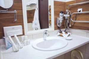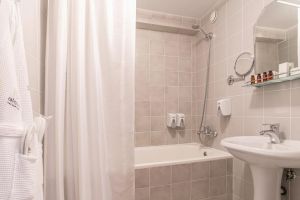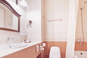 Ванна или душевая кабинка, фен, детская подставка для ног, детское сиденье на унитаз, диспенсер с гигиеническими салфетками, комплект полотенец, халат, тапочки, набор гостиничной косметики.