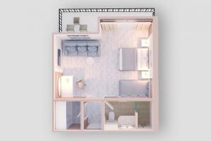 Односпальная кровать, шкаф, туалетный столик, пуф, тумба, мини-холодильник, ЖК-телевизор, сплит-система, внутренний телефон, сушилка для белья. Балкон отсутствует.