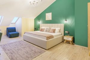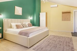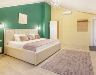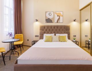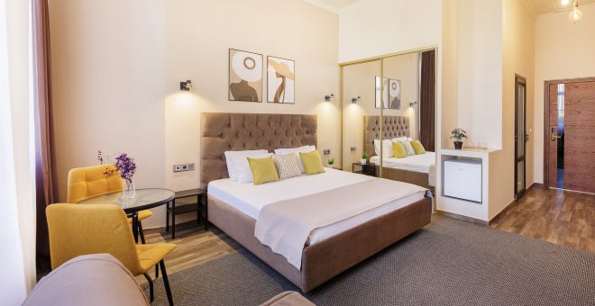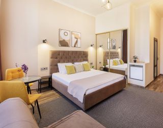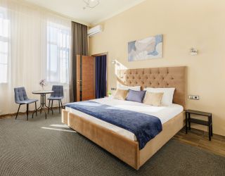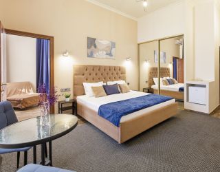 - Двуспальная кровать, Кресло-кровать, Телевизор, Телефон, Wi-Fi, Кондиционер, Сушилка для белья, Душ, Полотенца, Косметические принадлежности, Фен, Халат, Тапочки
