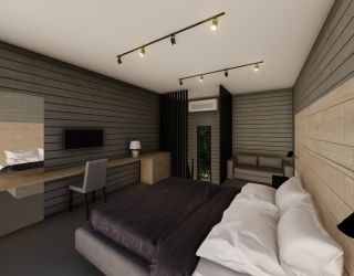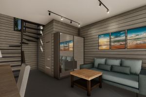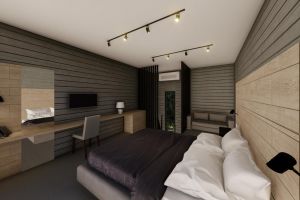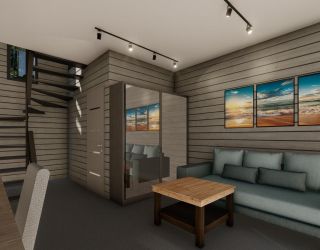 Каждый номер (апартамент), общей площадью 48 кв.м., представляет собой отдельно стоящий двухэтажный дом, построенный из экологически чистого материала – деревянного бруса.