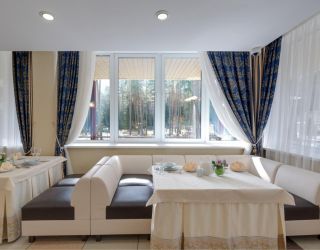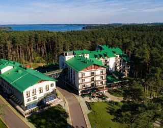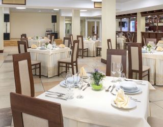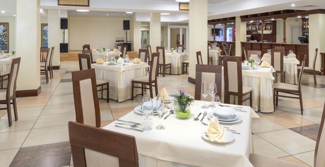 На территории отеля расположен ресторан с террасой на 200 посадочных мест. С ресторана открывается прекрасный вид на лесной массив и территорию комплекса. Меню ресторана, в основном, состоит из блюд национальной белорусской и европейской кухонь.