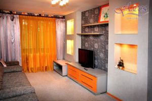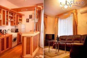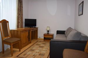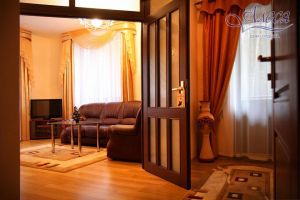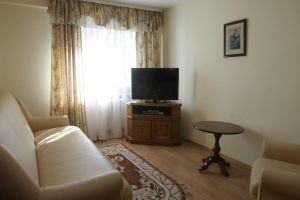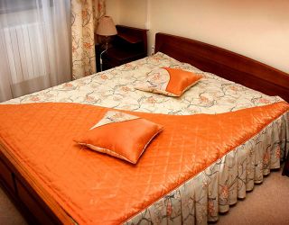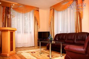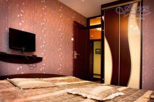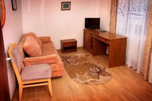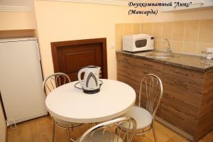 В двухкомнатном люксе в одной комнате стоит двуспальная кровать, во второй комнате диван. В каждой комнате телевизор. Холодильник, чайник, микроволновка, стол, стулья, удобства в номере.