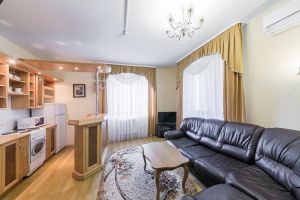 В трехкомнатном люксе две спальни, гостиная, кухня. В одной спальне расположена двуспальная кровать, телевизор, стол, стулья; во второй – две полуторные кровати, стол, стулья, телевизор. В гостиной расположен угловой диван, телевизор. Кухня оборудована электрической плитой, микроволновкой, холодильником, чайником.
