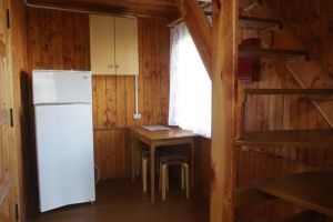 Летный домик состоит из 2-х этажей. На нижнем этаже расположены две кровати, холодильник, телевизор, наличие электрочайника, на втором этаже расположена кровать и кресло-трансформер. В летних домиках отсутствует горячая вода и душ. Душевые кабины расположены рядом в спортивном зале.