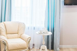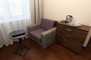 Номера во втором корпусе помимо кровати шириной 120 см укомплектованы раскладным креслом-кроватью, что позволяет разместить ещё одного человека на дополнительном спальном месте.