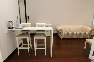 Из дополнительных удобств в номере есть большой круглый стол, который можно использовать для занятий, игр, а также семейных чаепитий.