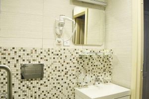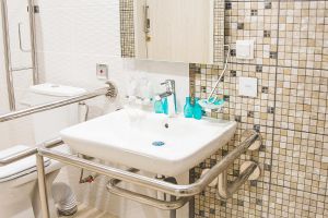 Ванные комнаты номеров для инвалидов-колясочников дополнительно оснащены открытой душевой кабиной со специализированными опорными ручками и сиденьем, поручнями.