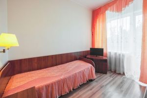 В номере: кровать односпальная, диван, стулья, телевизор, две тумбочки, журнальный столик, шкаф, утюг, гладильная доска, фен, посуда, чайник, холодильник.