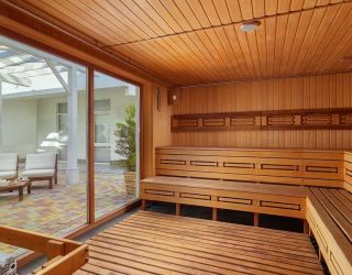 В гостиной: диван-кровать, кресло, журнальный стол, торшер, обеденный стол, четыре стула, сервант с посудой, мини-холодильник, телевизор, сплит-система, чайная станция. В спальне: одна двуспальная кровать, две прикроватные тумбы, стол, стул, шкаф, мини-сейф, телевизор, внутренний телефон, сплит-система. В прихожей: встроенный шкаф, гладильная доска, утюг, зеркало. На террасе: инфракрасная сауна на 2-х человек (вход с террасы), душ, зона отдыха - стол, диван и два кресла, софа, две тумбочки, сушилка для белья (мебель из искусственного ротанга).