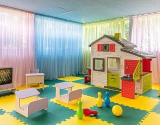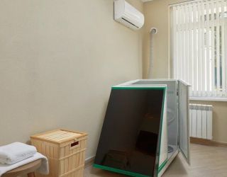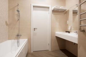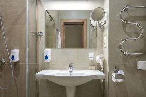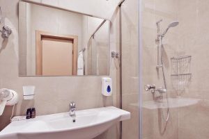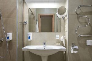 Душевая кабина, зеркало, зеркало косметическое, фен, диспенсер с гигиеническими пакетами, диспенсер с жидким мылом, комплект полотенец, халаты, тапочки, набор гостиничной косметики, детская подставка для ног, детское сиденье на унитаз.