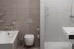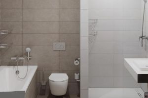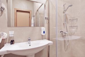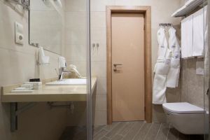 Душевая кабина, раковина, зеркало, зеркало косметическое, фен, диспенсер с гигиеническими пакетами, диспенсер с жидким мылом, комплект полотенец, халаты, тапочки, набор гостиничной косметики, детская подставка для ног, детское сиденье на унитаз.