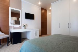 Одна двуспальная кровать, прикроватные тумбы, диван, кресло, косметический столик, журнальный стол, стул, настольная лампа, телевизор 49 дюймов, зеркало, телефон (внутренняя связь), сплит-система, чайная станция. В прихожей: встроенная оборудованная гардеробная с полками, мини-сейф, мини-холодильник, гладильная доска и утюг, зеркало. На балконе: два складных стула и сушилка для белья.