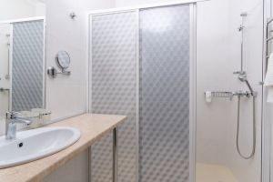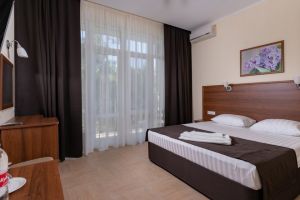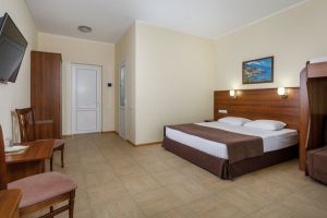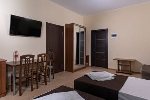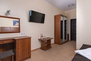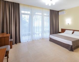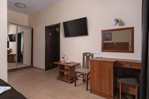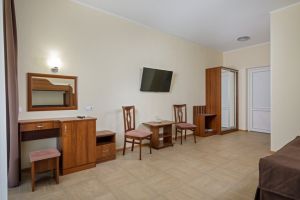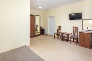 В номере: двухспальняя кровать 1.8х2, ТВ 32 диагональ, 2 тумбочки, журнальный столик, 2 стула, стол с зеркалом, пуфик, шкаф с зеркалом, чемоданница Сан узел 4.5 м2. Душевой поддон, зеркало, фен, жидкое мыло + шампунь Балкон