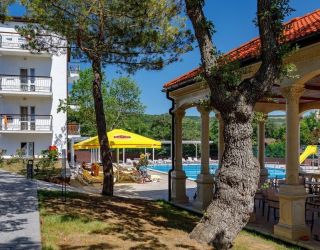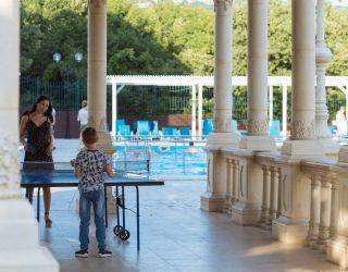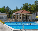 Бассейн размером 12х20 метров состоит из двух чаш для взрослых и одной для детей, оснащён водной горкой. Территория оборудована шезлонгами с матрасами, теневыми навесами, душами и кабинами для переодевания.