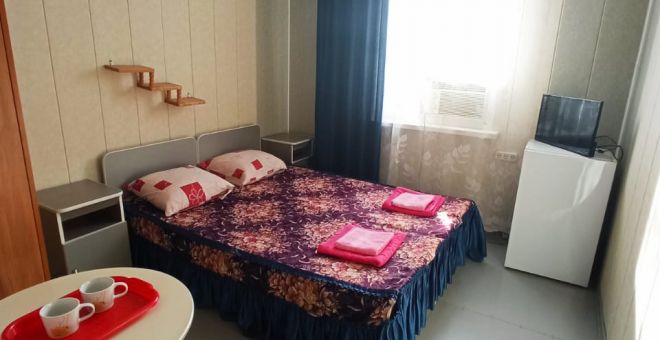 - Кровать двуспальная, тумбочки прикроватные, шкаф, кондиционер, телевизор, холодильник, санузел (душ+туалет)