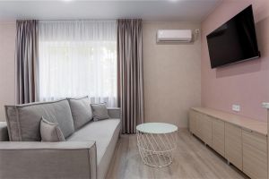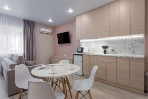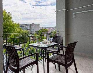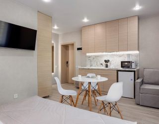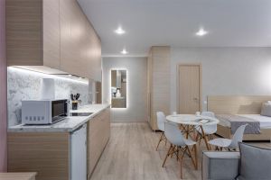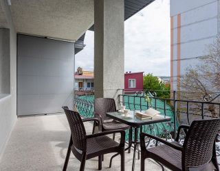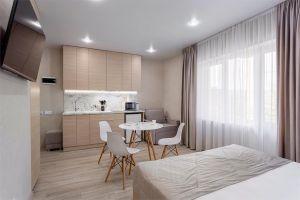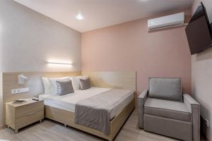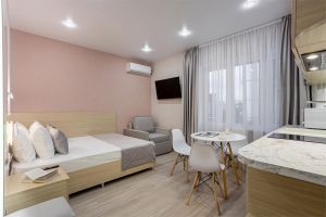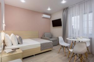 Стандарт плюс - это удобный однокомнатный номер, который радует гостей увеличенной площадью и вмещает до трех человек. В номере 2 основных места, и спальное место (раскладное кресло) для третьего члена семьи. Благодаря этому номер позволяет комфортно разместиться паре или родителям с ребенком. В номере есть балкон с чудесным видом на живописный городской закат. Площадь номера -21 кв.м. Есть встроенная кухня и балкон с видом на внутренний дворик . Оснащение: Одна большая кровать, прикроватные тумбочки, раскладное кресло -кровать, журнальный столик, пуфик , вместительный шкаф «купе», Кондиционер, телевизор, электронные замки, столик со стульями на балконе. Санитарная комната оборудована современными сантехническими устройствами имеет стильный и функциональный дизайн, удобная душевая кабина, шкафчики для хранения косметических принадлежностей, широкий умывальник, чистые полотенца. В комплект каждого гостя входит: