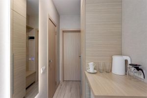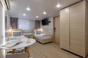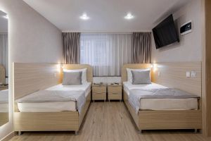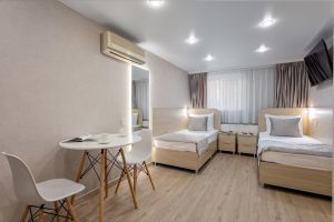 Эконом с двумя раздельными кроватями предназначен для командировочных постояльцев и предлагает раздельные кровати. Этот вариант представляет сочетание комфортного, но бюджетного проживания, идеальное для отдыха после рабочего дня. Номер оборудован всем необходимым, чтобы обеспечить приятное и удобное проживание для гостей в командировке. Площадь номера 15 кв.м. Есть встроенная кухня. Оснащение: Две раздельные кровати с мини освещением над каждой, две прикроватные тумбочки, большой шкаф, рабочее место (стол /стул) , оборудованная хозяйственным инвентарем кухня , телевизор , кондиционер, электронные замки. Санитарная комната создана с приоритетом комфорта и гигиеничности. Она оборудована современными сантехническими устройствами имеет стильный и функциональный дизайн, удобная душевая кабина, шкафчики для хранения косметических принадлежностей, широкий умывальник, чистые полотенца. В комплект каждого гостя входит: