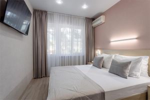 Наши стандартные номера - это уютное и спокойное пространство идеальное для семейных пар. Нейтральные тона мебели , штор и комфортная обстановка создают расслабляющую атмосферу. Здесь Вы найдете все необходимое для приятного пребывания и наслаждения вдвоем. Номера данной категории оснащены балкончиками предоставляющими вид на закат солнца. Они созданы для истинных ценителей отдыха и восхищения великолепными закатами над Геленджиком. Площадь номера -15 кв.м. Есть балкон с видом на крыши домиков и на город. Оснащение: Одна большая кровать, прикроватные тумбочки, вместительный шкаф «купе», Кондиционер, телевизор, электронные замки, столик со стульями на балконе. Санитарная комната создана с приоритетом комфорта и гигиеничности. Она оборудована современными сантехническими устройствами имеет стильный и функциональный дизайн, удобная душевая кабина, шкафчики для хранения косметических принадлежностей, широкий умывальник, чистые полотенца. В комплект каждого гостя входит:
