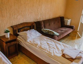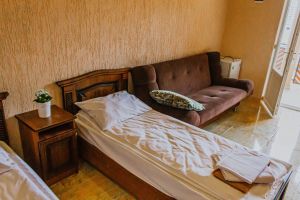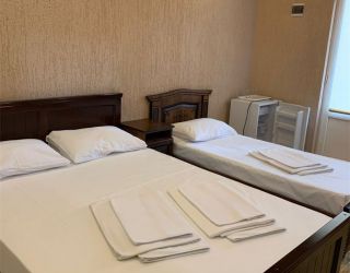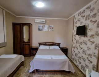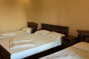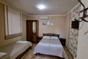 - Двуспальная и две односпальные кровати, мебельный гарнитур, тумбочки прикроватные, холодильник, кондиционер, телевизор, санузел (душ+туалет).