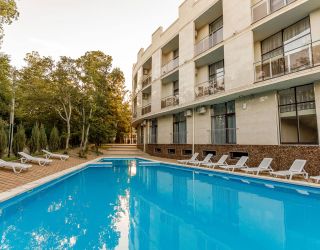 Номера категории стандарт имеют выход на общую террасу, окруженную соснами.