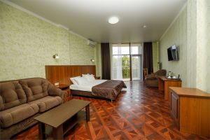 Просторный номер площадью от 40 квадратных метров подойдет для семьи с детьми или небольшой компании до 4 человек. Кроме двуспальной кровати большого размера, в номере есть дополнительный раскладной диван, необходимая мебель, телефон, мини-холодильник, телевизор, сейф, чайные аксессуары, беспроводной доступ в интернет.