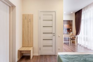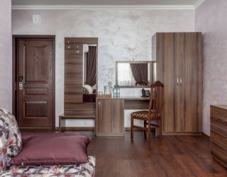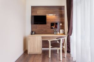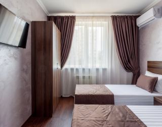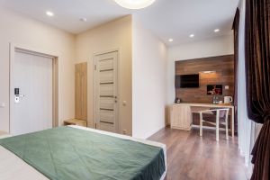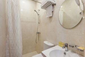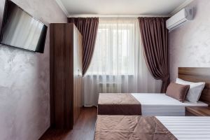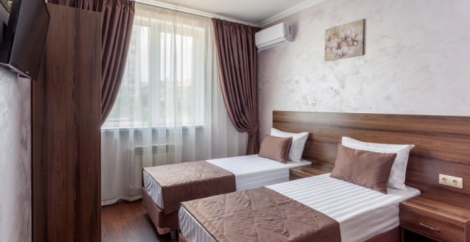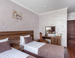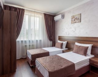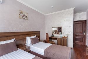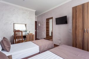 - Двуспальная кровать/2 односпальные кровати, прикроватные тумбочки, кондиционер, телевизор, холодильник, чайник, сейф, фен, шкаф, туалетный столик, стул, ванная комната с душем в номере. 14 кв. м.