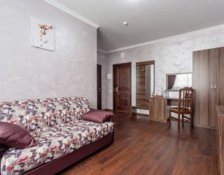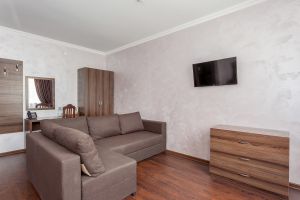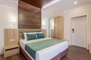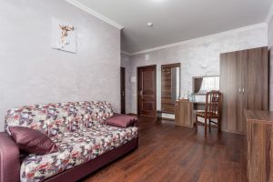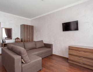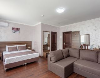 - Двуспальная кровать, диван, прикроватные тумбочки, 2 кондиционера, 2 телевизора, холодильник, чайник, сейф, фен, шкаф, комод, стол, стул, зеркало, ванная комната с душем в номере, балкон. 26 кв. м.