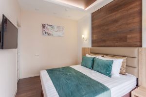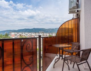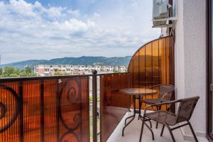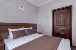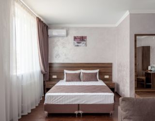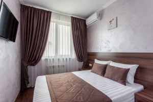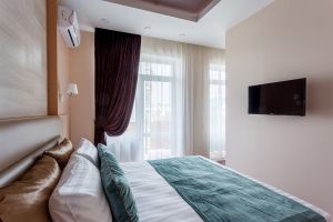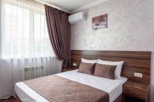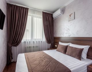 - Двуспальная кровать, прикроватные тумбочки, кондиционер, телевизор, холодильник, чайник, сейф, фен, шкаф-купе, стол, стул, ванная комната с душем в номере, балкон.18 кв. м.