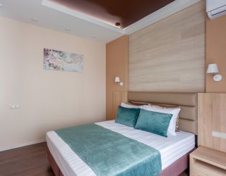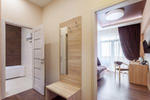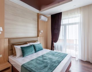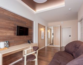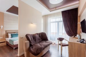 - Двуспальная кровать, двуспальный диван, прикроватные тумбочки, кондиционер, телевизор, холодильник, чайник, сейф, фен, шкаф, комод, стол, стул, зеркало, ванная комната с душем в номере, балкон. 25 кв. м.