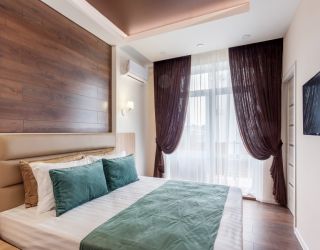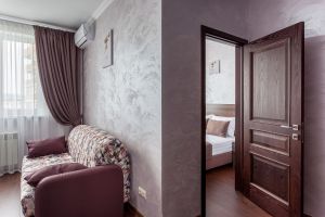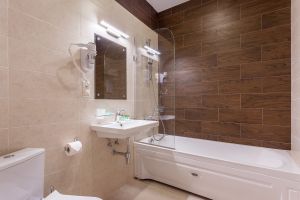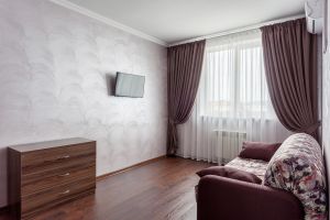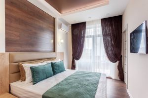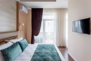 - Двуспальная кровать, диван, прикроватные тумбочки, кондиционер, 2 телевизора, холодильник, чайник, сейф, фен, шкаф-купе, стол, стул, зеркало, ванная комната с ванной и душем в номере, балкон. 29 кв. м.