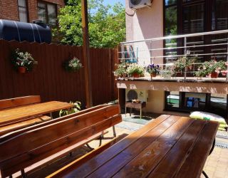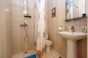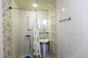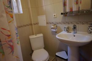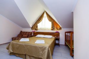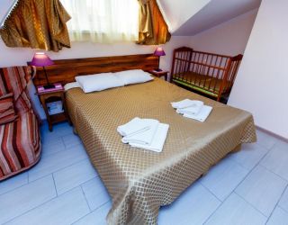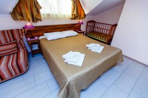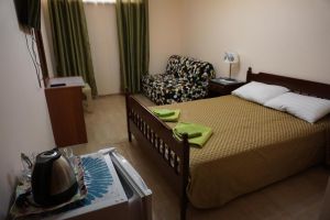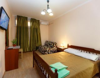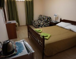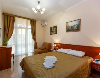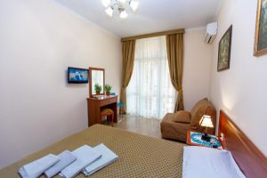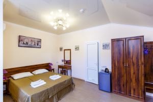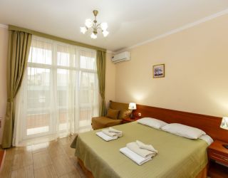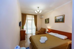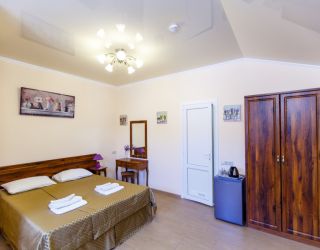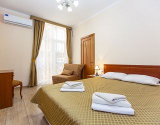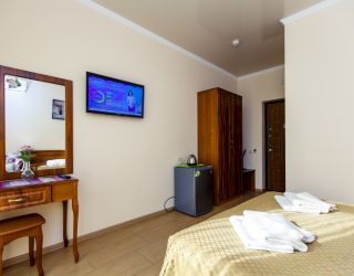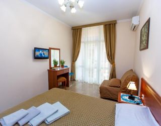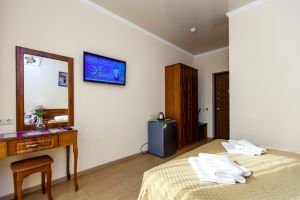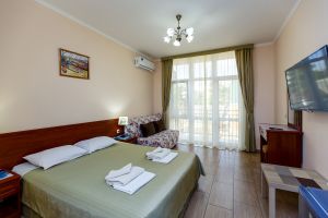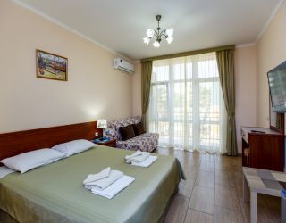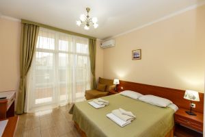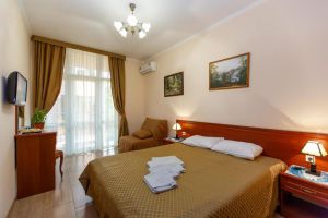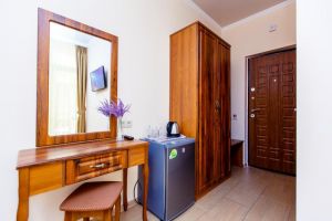 - Двуспальная или две односпальные кровати (спринг-бокс), кресло-кровать, шкаф, туалетный столик с зеркалом, прикроватные тумбочки, пуфик, электрочайник, на балконе сушилка для белья