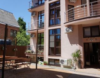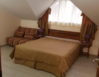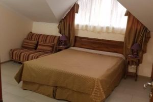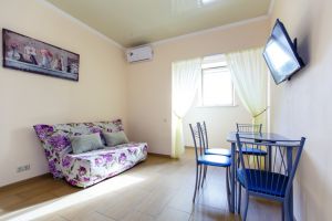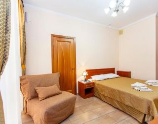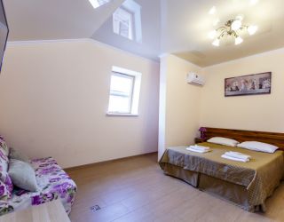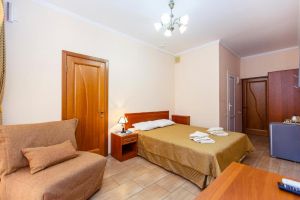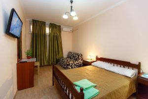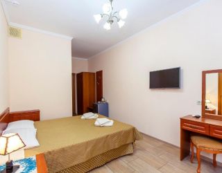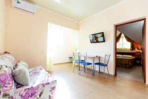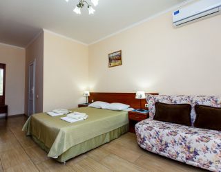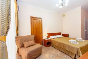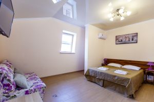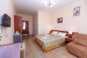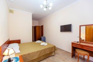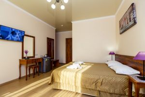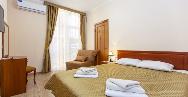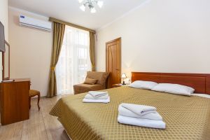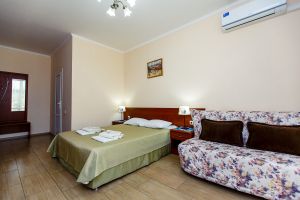 - Спальня - двуспальная или две односпальные кровати (спринг-бокс), кресло-кровать, шкаф, туалетный столик с зеркалом, прикроватные тумбочки, пуфик; гостиная – двуспальная или две односпальные кровати (спринг-бокс), журнальный столик, шкаф; сплит-система, д
