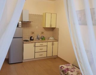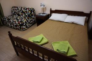 - Двуспальная или две односпальные кровати (спринг-бокс), диван-кровать, шкаф, туалетный столик с зеркалом, прикроватные тумбочки, пуфик, электрочайник, на балконе сушилка для белья.