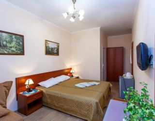 - Двуспальная или две односпальные кровати (спринг-бокс), диван-кровать, шкаф, туалетный столик с зеркалом, прикроватные тумбочки, пуфик, электрочайник.